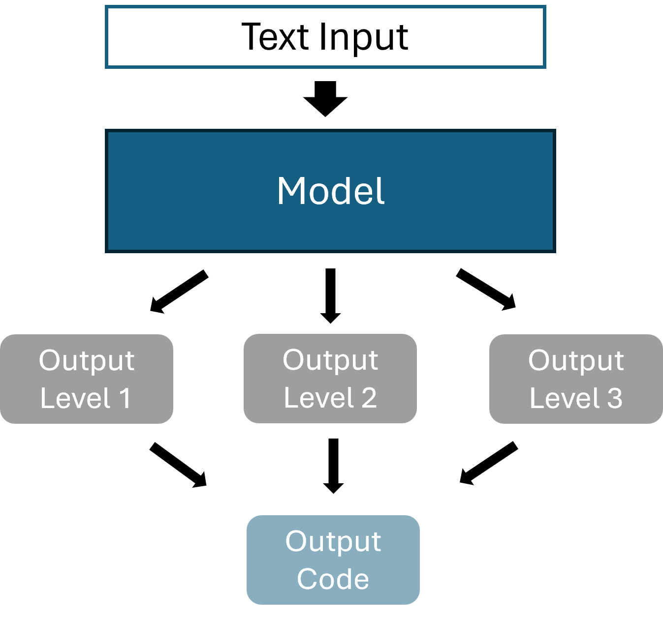 The multiple output model receives the same input as the flat classifier, but will generate three outputs, one per hierarchy level (illustrated below). In contrast to the stacked model, this approach only consists of a single model. For each input, we hence get three output vectors, containing the class probabilities for each output level. All three of these outputs need to be concatenated into one valid output codes. This again, like for the stacked model, poses the problem of generating invalid codes.