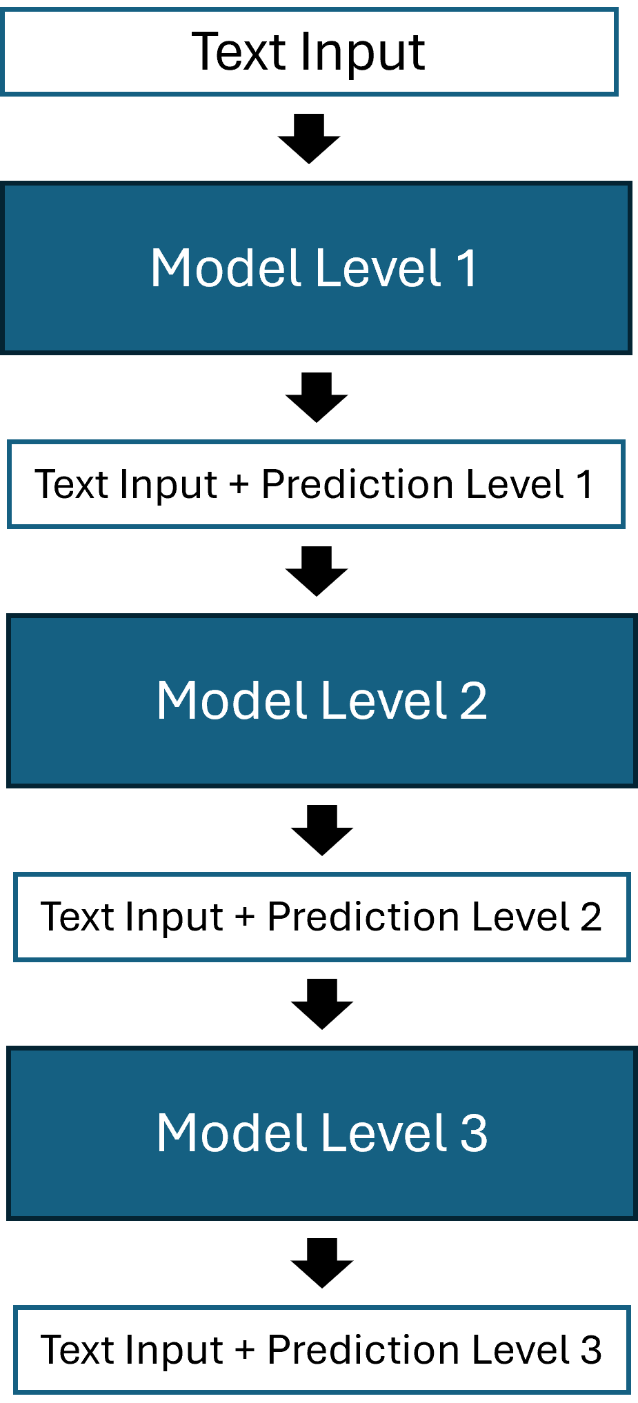 The idea of the stacked model is training one model per class level, resulting in three models. Supplementary to the input of the first model (input text as token sequence and as one hot encoded matrices), the second and third model are fed the probabilities for each class derived from the previous model. The input to the second and third model will therefore include the 85 and 86 predicted probabilities from the first and second model respectively (85 different classes for the first level, 86 for the second). By using multiple models to generate one output code, we introduce the problem of generating invalid codes, if we define the most likely code as the combination of all three most likely level-codes(one code per model). To overcome this issue, we filter out all invalid code combinations and only look at valid 5-digit codes. A more in detail explanation is given in section Top-k Codes for Models with Outputs per Level. The figure below illustrates the model architecture.