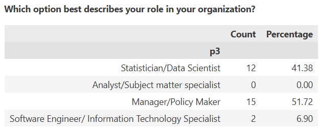 The results reveal that the majority of respondents are either Managers/Policy Makers or Statisticians/Data Scientists, representing 52% and 41% of the total responses, respectively. A small portion of responses (7%) came from Software Engineers or IT Specialists. Notably, no responses were recorded from Analysts/Subject Matter Specialists, which may reflect the focus of ML initiatives within the participating institutions or the distribution of expertise involved in such projects.