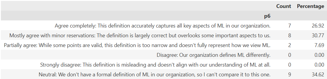 To better understand the overall sentiment toward the proposed definition of Machine Learning, we attributed ordinal values to each response (from 6 for “Agree completely” to 1 for “Strongly disagree”). The resulting average score was 4.5, and the median was 5, suggesting that respondents mostly agree with the definition, albeit with some reservations. This reinforces the idea that while a majority are aligned with the description, there remains space for interpretation and further clarification of ML concepts within NSIs.