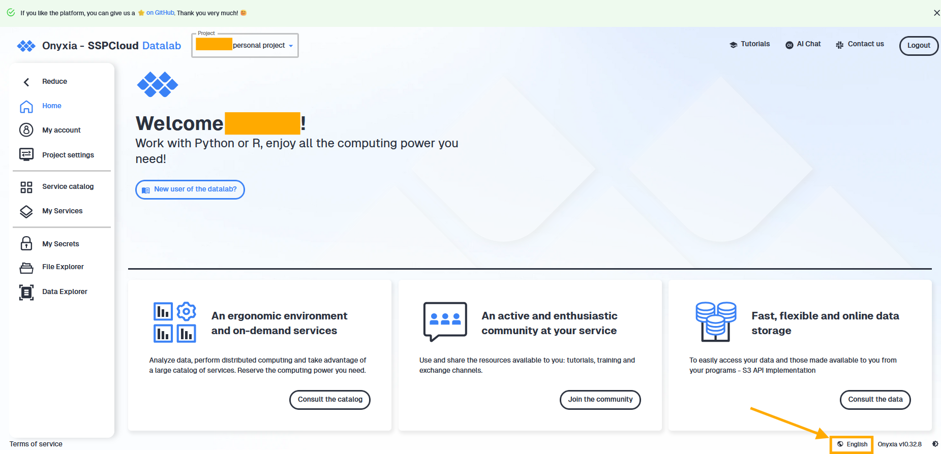 • You need to have an account on Insee’s Onyxia platform, called SSPCloud (for cloud platform for the French Official Statistical System). When you are on this webpage, you should see something similar to this image once you’re logged in. To change the language, you can do so on the bottom right part of the webpage (see the orange arrow on the screen shot below).