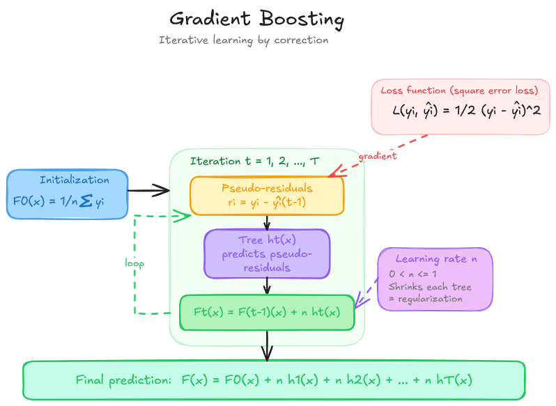 Gradient Boosting builds trees sequentially: each new tree is trained to correct the prediction errors — the pseudo-residuals — left by all previous trees. Formally, at each iteration \(t\) the model is updated as:
